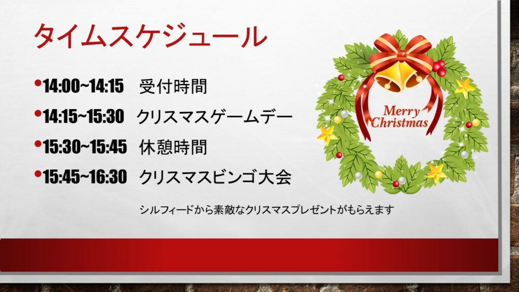 ゲームデー終了後は、参加者でクリスマス会を行います!ビンゴ大会でシルフィードからの素敵なクリスマスプレゼントがもらえます!