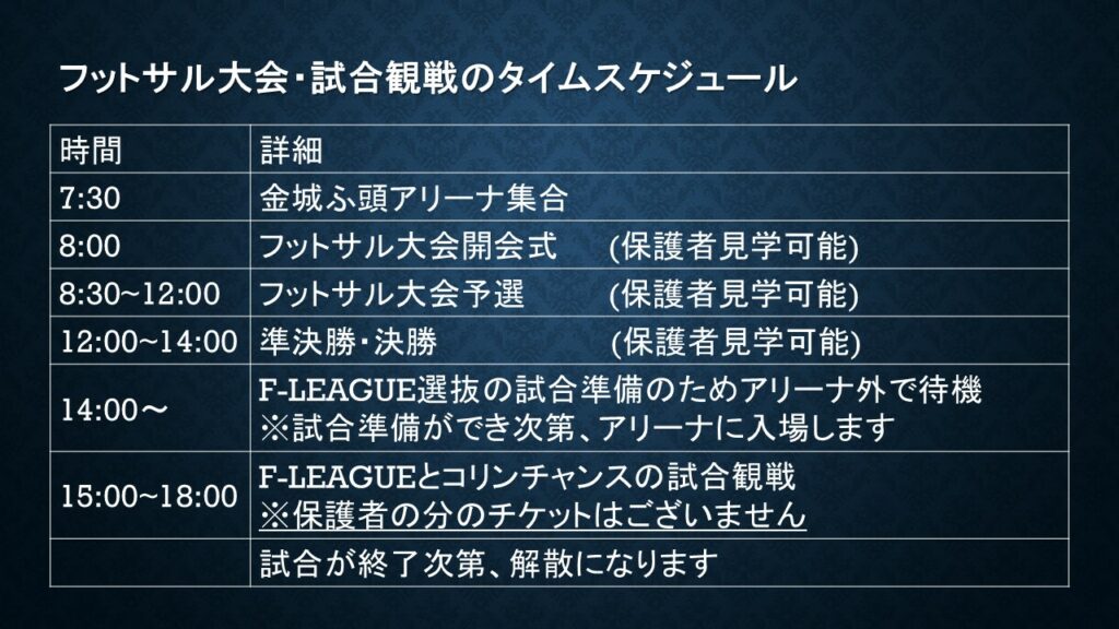 ③保護者で「F-LEAGUE選抜とコリンチャンスの試合」の観戦を希望される場合は、「チケットぴあ」で観戦チケットを購入してください。