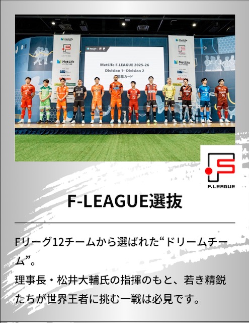 F-LEAGUE選抜は松井大輔氏が選手兼監督を務め、最強王者コリンチャンスに挑みます!世界基準のプレーを観れる絶好のチャンス!