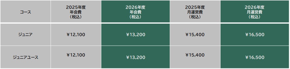 昨今のエネルギーコスト高騰をはじめとした諸物価の上昇がクラブ運営においても大きな影響を及ぼしております。今後も現行のスクール、チーム活動を維持、発展させていくためにこの度、運営費の改定をさせていただくこととなりました。会員の皆様にご負担をかける事となり、心苦しいかぎりではございますが何卒諸事情をご賢察いただき、ご理解くださいますようお願い申し上げます。