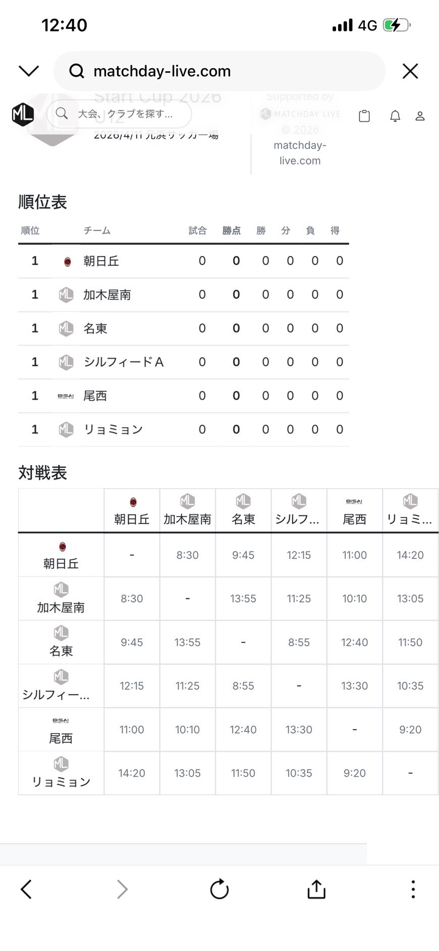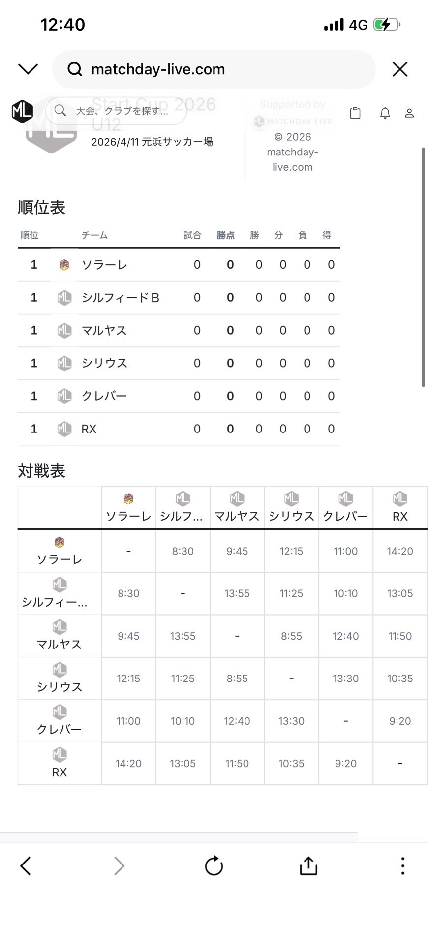 4/11(土) 新U12 Start Cup U12について 2026年4月4日 チーム・スクール U12 2026年4月11日(土) Start Cup U12 CittaSolare主催大会についてのお知らせです。 大会スケジュールは下記URLからもご確認いただけます。 【https://matchday-live.com/race/Ars3ezDP】 4/11(土)スケジュール① 4/11(土)スケジュール② 星取表① 星取表②